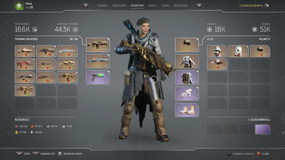 Recalcamos que subir de nivel en Outriders es satisfactorio y fácil de gestionar. El árbol de habilidades se inspira obviamente en la franquicia Diablo, pero hay otras influencias como Path of Exile. Cada una de las cuatro clases tiene tres ramas para perfeccionar su estilo de combate. Nos encanta entrar en todas las batallas como disparando a loco, por lo que las clases Piromante y Devastador son nuestras favoritas, y nos especialicé en cada una eligiendo las habilidades más ofensivas de la rama. También hay ramas más estratégicas, como la defensa total o un enfoque híbrido, todas ellas simplificadas de forma que no resulten abrumadoras y no me hagan dudar si he tomado una decisión equivocada.