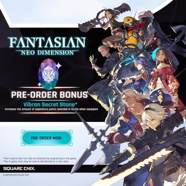 Los jugadores que realicen la pre-compra el juego recibirán un objeto de bonificación dentro del juego, la “Vibran Secret Stone*, que proporciona un aumento de experiencia a cualquier personaje cuando está equipada. Para más información, visita: https://fantasianneodimension.square-enix-games.com/